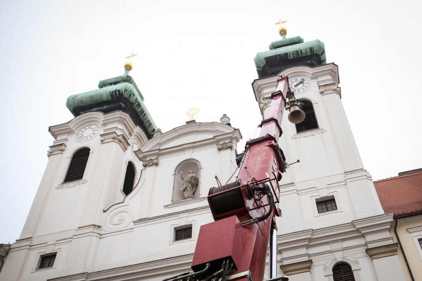 1916-ban, az első világháború idején a vallás- és közoktatásügyi miniszter rendeletével a magyar templomok nélkülözhetőnek titulált harangjait elrekvirálták. Ez a bencés templom nyugati tornyában őrzött négy harang vesztét jelentette: az 1717-ben öntött Szent Miklós-, az 1656-ban készült Szent Mihály-, az 1727-ből származó Xavéri Szent Ferenc és Szent György-, illetve az 1737-es Szent Donát-harangot leszerelték és beolvasztották. Csak az 1744-ben Bécsben, Szent Ignác tiszteletére öntött, majd 1853-ban Kőszegen Szent Benedek nevére újraöntött harang maradhatott meg. 1916-tól 2016-ig ez volt a bencés templom egyetlen harangja. A harangrekvirálás 100., a templom felszentelésének 375. évfordulóján a győri bencés közösség kezdeményezésére, számos támogató adományából október 28-án az innsbrucki Grassmayr harangöntő műhelyben készült el a hat új harang, Szent Mór, Szent Mihály, Szent Ignác, Szent Márton, Szent Maurus és Szent Placidus tiszteletére ajánlva. Innsbruckból Rómába szállították a harangokat, amelyeket Ferenc pápa a december 7-i általános kihallgatás előtt megáldott a vatikáni VI. Pál terem előterében. December 11-én a Rómából Győrbe érkező harangokat ünnepélyes menet kísérte a Városháza elől a Széchenyi térre. A Szent Benedek-harang és az új harangok első együttes megszólalása december 24-én, karácsony éjszakáján, az éjféli szentmise előtt lesz.