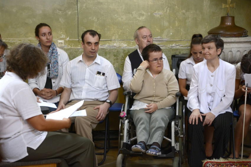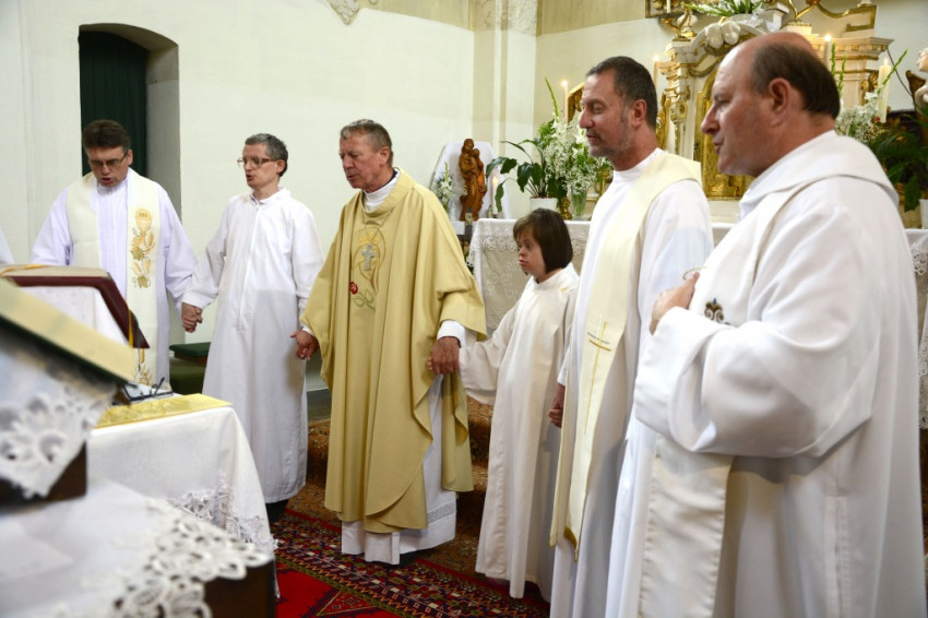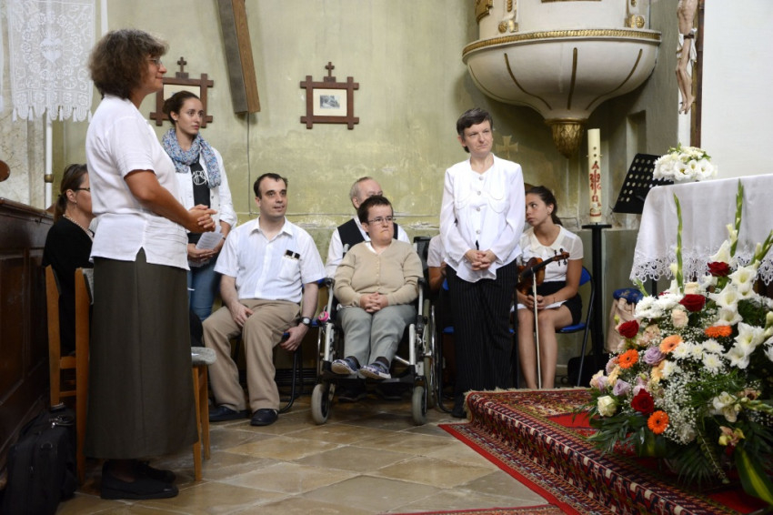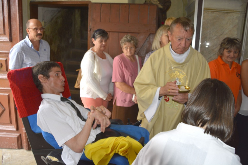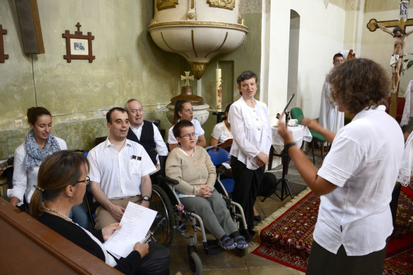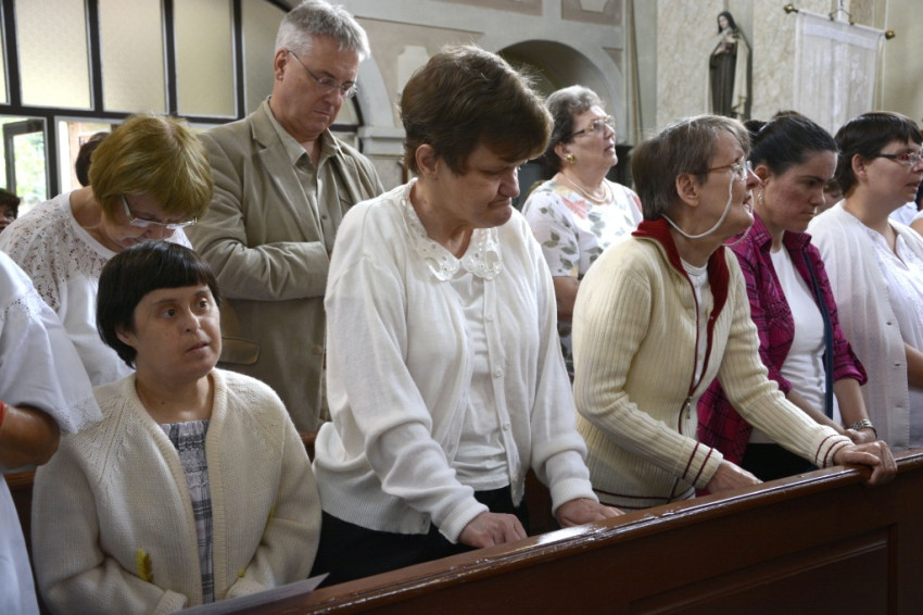A templom kapujában egy Down-szindrómával élő kedves lány fogadott nagy szeretettel és öleléssel, mintha már én is a családhoz tartoznék. „Itt van az Úr, énekeljünk örömmel, örömmel, örömmel / Testvéreim énekeljünk örömmel / Mert az Úr jött közénk el” – zengett az ünnepi szentmise bevezető éneke egy fiatal zenészekből és sérültekből álló kórus előadásában. Valóban örömmel énekeltek. És ez a közös öröm visszhangzott a püspök köszöntésében is, aki otthonosan mozgott a sérültek között, sokakat név szerint ismert.