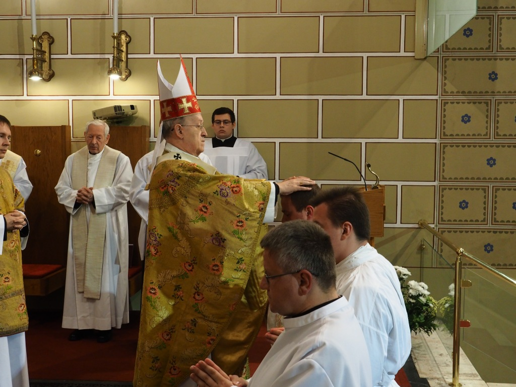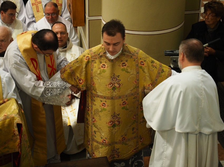 Az új diakónusokat végül beöltöztették liturgikus ruháikba: a stólát a bal vállukról a jobb oldalukon megkötötték, majd rájuk adták a dalmatikát. Márfi Gyula pedig egyenként átadta nekik szolgálatuk eszközét, az evangéliumos könyvet.