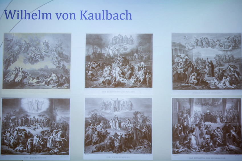 Az 1840-es évek második felétől Európa-szerte, így nálunk is nagy érdeklődés kísérte például a müncheni iskola egyik neves festője, Wilhelm von Kaulbach freskósorozatát, melyet a berlini Neues Museum lépcsőházában festett. A berlini sorozatban Kaulbach hat kompozíción keresztül vázolta fel a világtörténelmet, s felettük is további mozzanatokat ábrázolt szalagképen. A választott jelenetek a következők voltak: A hunok csatája, Jeruzsálem pusztulása, Görögország aranykora, A babiloni torony, A keresztes hadjáratok, A reformáció kora – ez utóbbit 1864-ben fejezte be, s Arany János lapja, a Koszorú is hírt adott róla. További magyar vonatkozása is van a freskósorozatnak. A hunok csatájának metszetét az 1850-es években Eötvös József meghozatta Berlinből a Csaba-trilógián dolgozó Arany János számára; ugyancsak magyar kapcsolat, hogy Liszt Ferenc személyesen is megtekintette a készülő freskókat, és az 1850-es évek második felében az általa létrehozott szimfonikus költemény műfaj, illetve sorozat 11. darabjaként A hunok csatáját is „megzenésítette”. Frideczky Frigyes idézi Liszt egyik nyilatkozatát, miszerint szándékában állt Kaulbach összes festményét „megkomponálni”, „talán »A történelem drámája« vagy más megfelelő cím alatt”.
