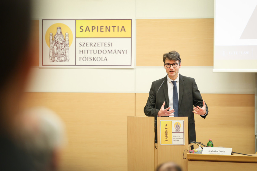 A szekciót Szabados Tamás, az ELTE Állam- és Jogtudományi Karának dékánhelyettese zárta Értékek a magánjogban című előadásával. A nem szakértő hallgatóság számára is érthetően megvilágította többek között a nemzetközi magánjog problémás eseteit, és rámutatott arra is, hogy a jog értékhordozó, az értékek védelmének egyik mechanizmusa.