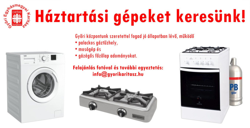 A győri karitászközpontba (9027 Győr, Kandó Kálmán u. 10.) jó állapotban lévő, működő palackos gáztűzhely, mosógép és gázégős főzőlap adományokat várnak – olvasható a felhívásban.