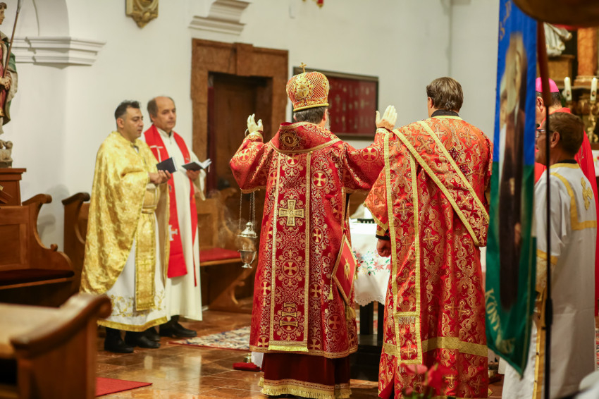 Látogatásunkkor Orosz Atanáz püspök mutatta be a szent liturgiát. „Hegymenetben vagyunk” – kezdte beszédét a főpásztor. „Láttam Uram a hegyeidet. S olyan kicsike vagyok én” – József Attila versével hívott meg, hogy Urunk színváltozása ünnepén átgondoljuk, miért akarunk, és miért kell felmennünk a hegyre, mire van szükségünk, hogy feljussunk a magasba.