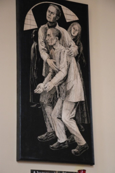 – A 3,2 méteres nagy kereszt két oldalán a Szűzanya és János apostol alakja található, majd a két oldalsó falon a magyar és erdélyi szentek. A magyar szentek közül Szent István, Szent Imre, Szent László, Árpád-házi Szent Erzsébet és Árpád-házi Szent Margit, aki nekem is védőszentem. Abban a sorrendben a másik oldalon, ahogyan a hívek látják: Pongrácz István, Boldog Apor Vilmos, boldog emlékű Márton Áron püspök és az utolsó tábla a kommunizmus vértanúinak táblája. A technikája fametszet, csakhogy a fametszetet nem vonom le papírra, hanem a fametszetet mint táblaképet tesszük fel. Tehát nem festve vannak, mint a régi középkori oltárképek, hanem metszettem. Ha metszed, akkor nem hibázhatsz. Én mindig imádkoztam előtte, és kértem az Urat, hogy ő vezesse a kezemet. Valójában a művészet a Jóisten kegyelme. Az ember semmiféle dicséretet nem érdemel. Ha valaki dicséretet érdemel, az a Jóisten. De állandóan! Tőle kapok mindent. Most soroljam fel? A lélegzettől kezdve a szorgalomig, a tehetségig, mindent tőle kapok. Tulajdonképpen ő munkálkodik bennem, és én ezt kérem. Az erőt is tőle kapom, a kitartást is tőle kapom. Mindent! Egyedül őt dicsérhetjük, embert soha. Ez nagyon fontos! Túlságosan elterjedt a mai világban, hogy agyondicsérjük a művészeket, az előadóművészeket, a sportolókat. Azt mondják, valamit csinált – mintha a másik ember nem csinált volna! Ez azt jelenti, hogy nem ismerjük el: mindannyian Isten képmására lettünk teremtve. Neki kell hálát adni. Amikor elkezdek rajzolni, mindig őt kérem. Mielőtt nekifognék, a papír fölött egy keresztet rajzolok a levegőbe: Uram, az legyen, amit te akarsz. Mert csak így lesz értelme! Mert mi telhet ki belőlem? Az ember önmagában semmi.