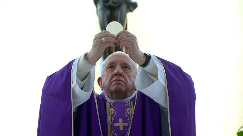 Hamvazószerdán, amikor a koronavírus miatti vészhelyzetet még nem fogtuk fel ennyire nyilvánvalóan, Péter utóda ezt mondta: „Hamvazkodással kezdjük a szent negyvennapot: »Emlékezz, hogy por vagy, és újra porrá válsz«. A fejünkre szórt por visszavisz bennünket a földre, emlékeztet, hogy földből vétettünk és visszatérünk a földbe. Vagyis gyengék, esendők, halandók vagyunk. Az évszázadok és évezredek folyamán csak átmenetiek, a galaxisok és a világűr mérhetetlenségével szemben parányiak vagyunk. Por vagyunk az univerzumban. De Isten által szeretett por! Az Úr szeretetből felmarkolta porunkat, és belefújta az ő éltető leheletét. Tehát értékes por vagyunk, arra rendeltettünk, hogy örökké éljünk. Mi vagyunk a föld, amelyre Isten ráárasztotta egét; a por, mely álmait tartalmazza. Isten reménye, kincse, dicsősége vagyunk!” A pápa homíliáját ezekkel a szavakkal fejezte be: „Engedjük magunkat kiengesztelni, hogy szeretett gyermekként bocsánatot nyert bűnösként, meggyógyított betegként, kísért vándorként éljünk! Engedjük, hogy szeressenek, hogy szerethessünk! Engedjük, hogy felsegítsenek, hogy haladhassunk a cél felé, húsvét felé. Örömmel fogjuk felfedezni, hogy Isten feltámaszt bennünket hamvainkból.”