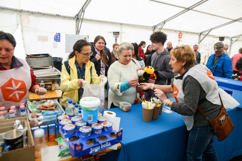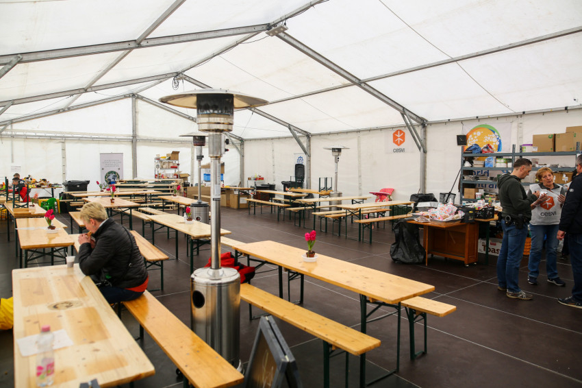A menekültek segítésére a határ innenső oldalán is szükség van, ezt még akkor is látjuk, ha a pályaudvaron, ami a Magyar Református Szeretetszolgálat által fenntartott segítségpontként is működik, most viszonylagos nyugalom tapasztalható. Egy-egy menekült, illetve kisebb csoport tolmács segítségével ingyenes vonatjegyet vált Budapestre, páran a baba-mama sarokban is vannak. Itt záhonyi és járásbeli védőnők teljesítenek önkéntes szolgálatot, ügyeletszerűen – mondja a tisztelendő asszony, Orsi, aki útközben csatlakozott hozzánk. A nagy fehér sátorban, ami alapvetően étkezésre van kialakítva, most még csak lassan gyülekeznek az emberek, hiszen délig több mint fél óra van hátra. Ám máris érkezik a meleg étel, amelynek nagy mennyisége azért árulkodó.