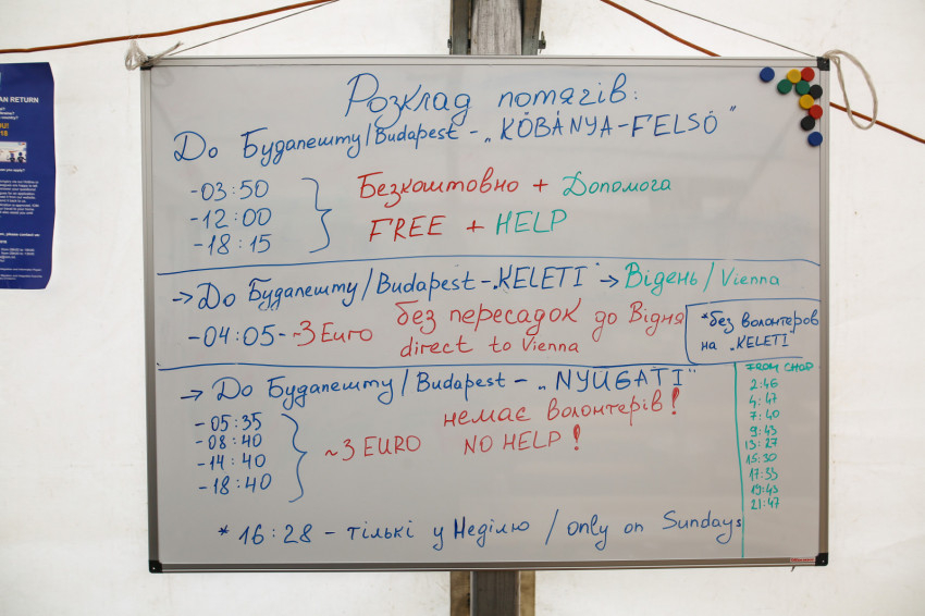 Ahogy a sátorfelelőstől, a frissnyugdíjas Ágitól megtudjuk, a héten kicsit kevesebb menekült jött át a határon, mint korábban. Négy vonat helyett most naponta három érkezik Ukrajnából, de huszonnégy óra alatt még így is nagyjából ezren megfordulnak Záhonyban. A Magyarországra menekülők száma egyrészt a stabil kárpátaljai körülmények miatt csökkent – sokan inkább az országuk területén maradnak, ott várják, hogy jobbra forduljon a helyzet; másrészt az átlépőktől kapott információk szerint a hatóságok nem engedik kilépni Ukrajnából azokat, akiknek tartozásuk van az állam felé.
