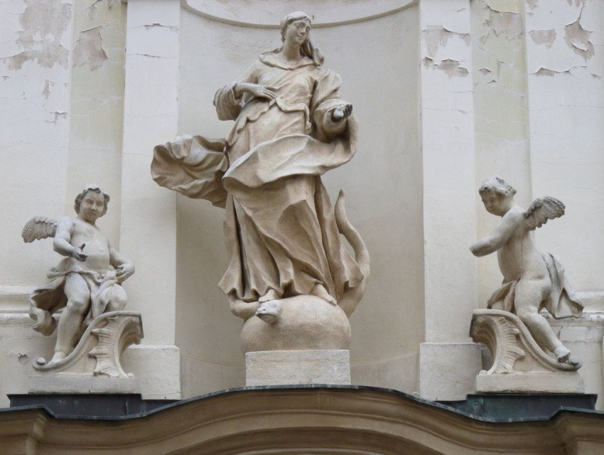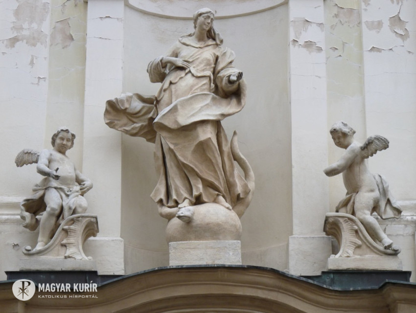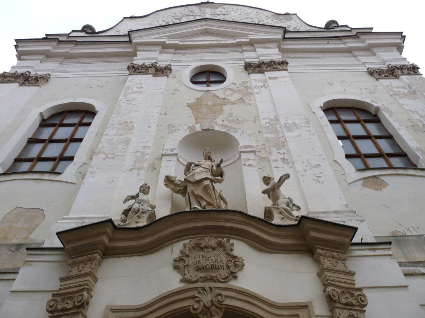A gótikus homlokzatot 1745-ben barokk stílusban építették át. A bejárat fölé az Immakuláta-szobor került két angyallal. A bejárati részben viszont látható az eredeti gótikus portál felújított töredéke, a Mária-himnuszból vett felirattal: „Monstra te esse Matrem” – „Mutasd meg, hogy Anya vagy”. Ez a ferences templomhoz történelmileg szorosan kapcsolódó Mária-tiszteletre utal.