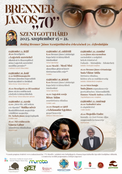 A programokat megtalálják a szentgotthard.hu oldalon az eseménynaptárban, valamint Szentgotthárd Város Önkormányzatának Facebook-oldalán és a Brenner János 70 Facebook-oldalon is, illetve a fenti plakáton.