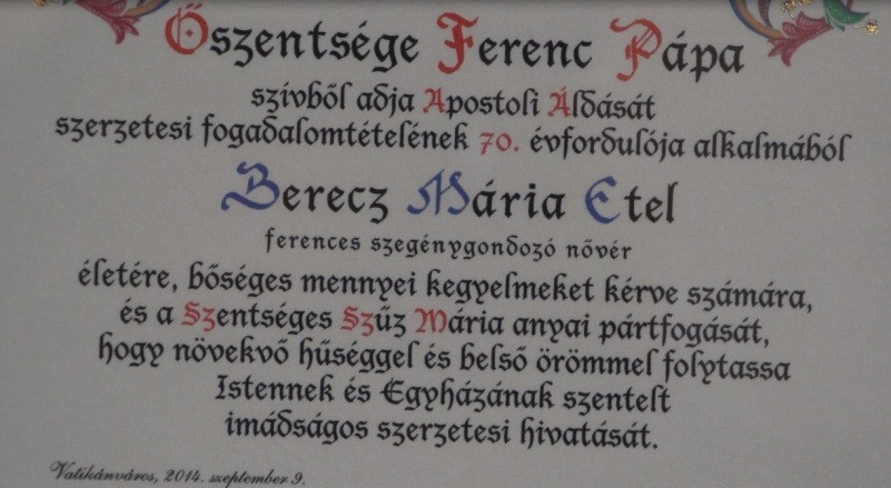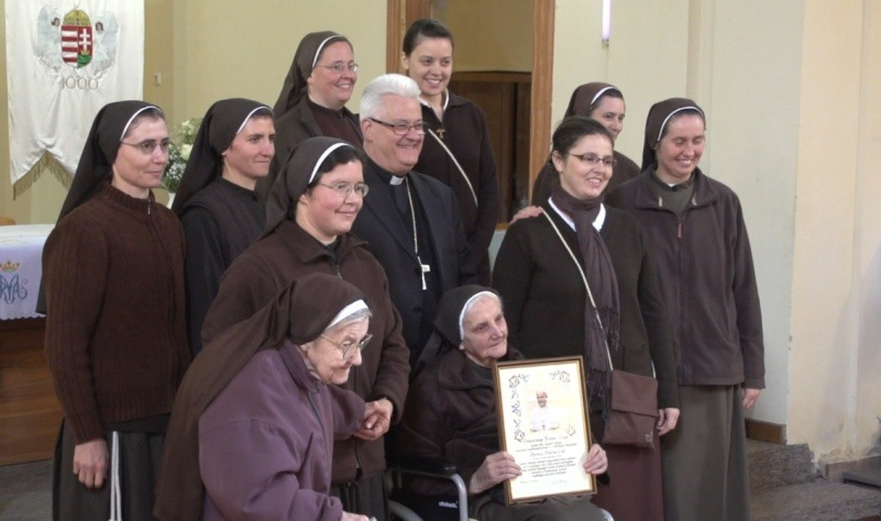 Az ünnepségen Spányi Antal átadta Etel nővérnek Ferenc pápa áldását.