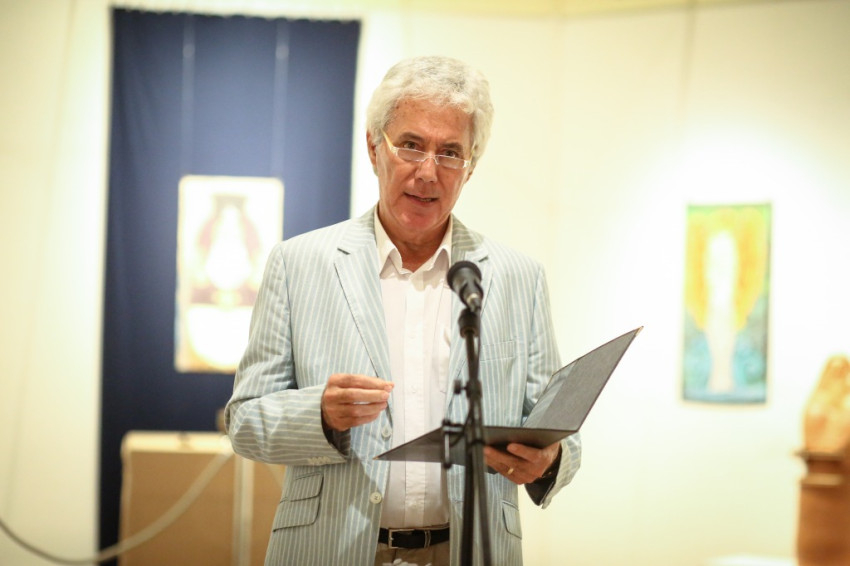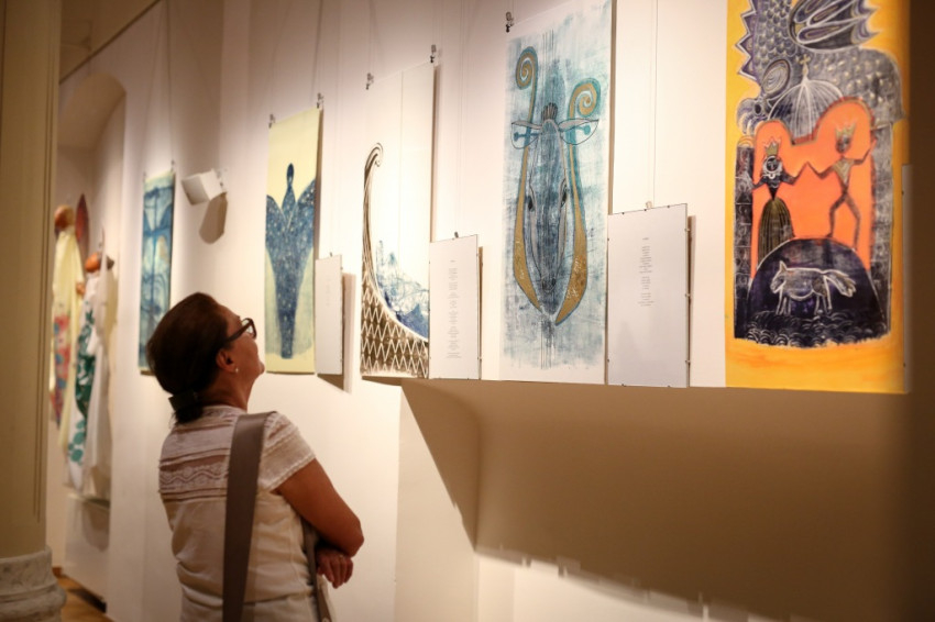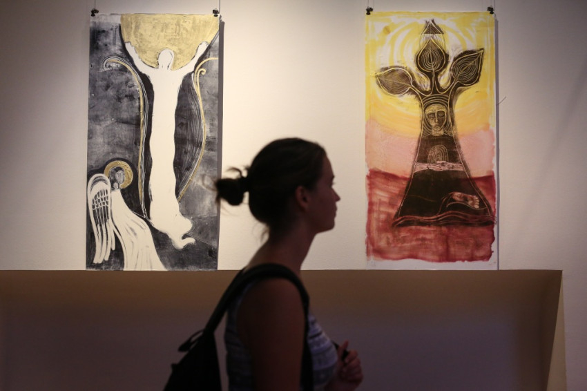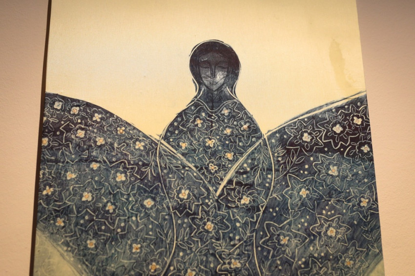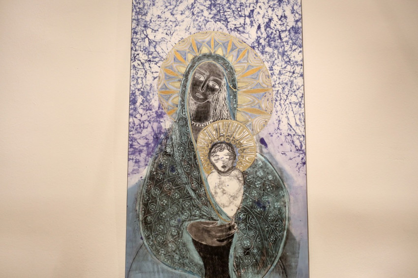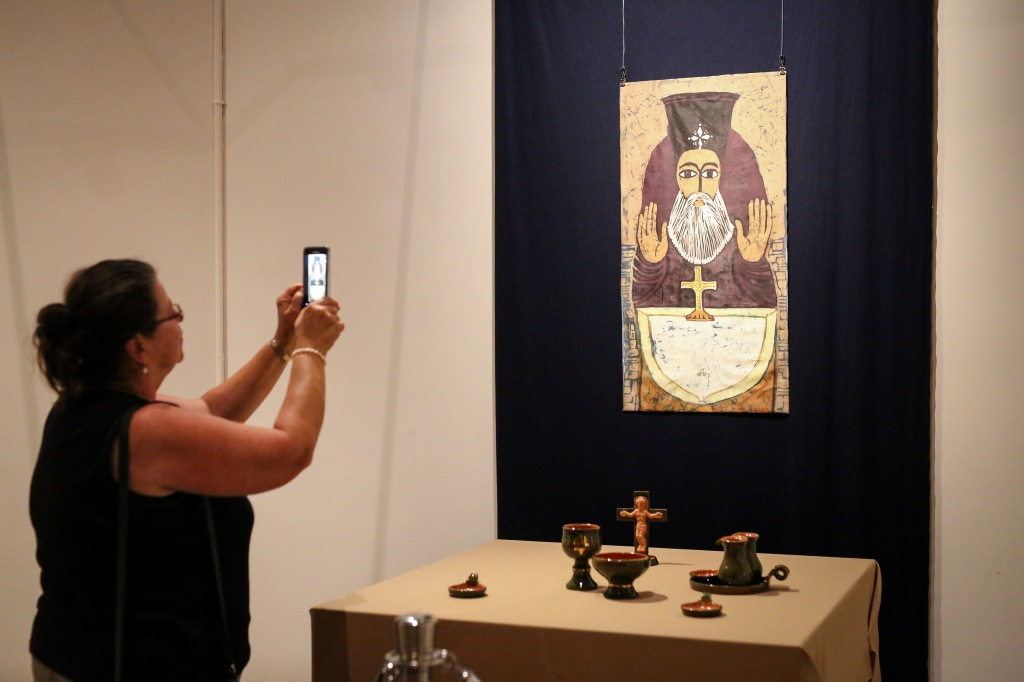 Különleges atmoszférájuk van a kiállításon a batikoknak – folytatta ismertetőjét Feledy Balázs. Kifejtette: a batik mint ősi textilfestő technika bonyolult, összetett művelet. Láthatjuk, hogy Kákonyi Júlia ezt is magas szinten műveli. A tulajdonságok és szent attribútumok megjelenítésében nincs semmiféle túldíszítettség; egyszerűség, puritánság jellemző ezekre, mint általában egész munkásságára.