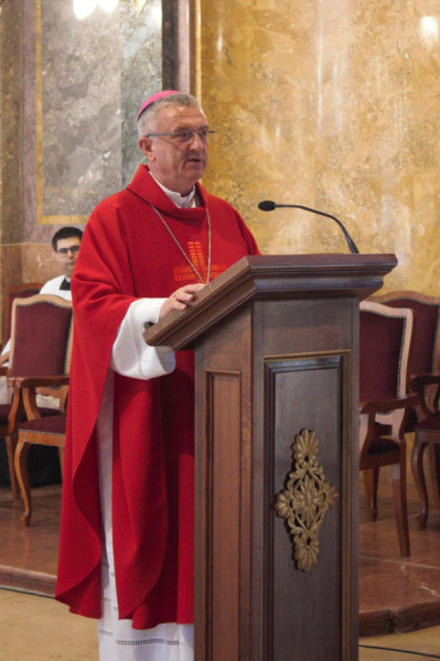 Szentbeszédében Veres András püspök az Istentől kapott hivatásról elmélkedett: a keresztségben az istengyermeki hivatást minden ember megkapja. Ugyanakkor Isten mindenkinek adott egy személyes, csak rá szabott feladatot. Ezt kell megtalálnunk földi életünkben, hogy beteljesíthessük Isten akaratát. Ha azt tesszük, amit a Gondviselés csak nekünk szánt, akkor megtaláljuk mind földi, mind örök boldogságunkat. Az egy test közösségében, Isten választott népében lehet másokéhoz hasonló hivatásunk is: ilyen a hitoktatói hivatás is.