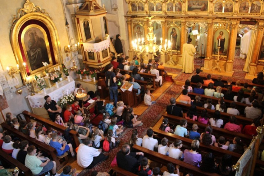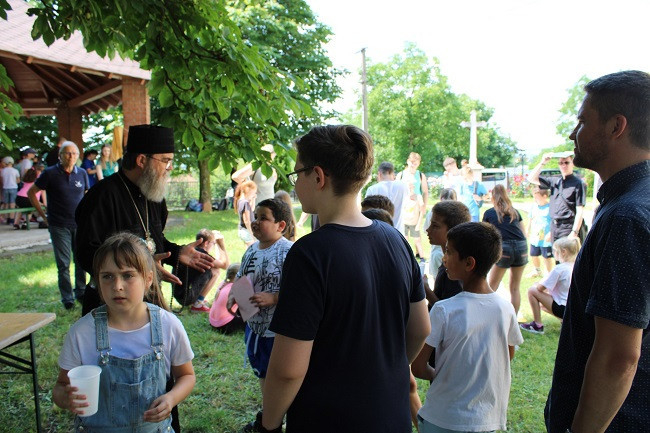 Több mint húszan vettük az akadályokat Szirma és Görömböly felől ezen a meleg napon, utunk 18 kilométer volt. Poros és kicsit késett érkezésünk után Szent Liturgiával kezdtük a napot, amelyen Orosz Atanáz püspök is részt vett. Csodálatos érzés volt, ahogy az egész templomot gyermeksereg töltötte be. Sose szoktunk a földre ülni egy templomban, de most ez is megtörtént.