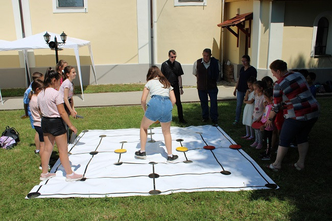 A prédikáció szavait megfogadva rengeteg csodás feltöltődés várt a gyerekekre. Kezdtük a tízóraival, amit rögtön megrohamoztunk, és utána jött a nyolcállomásos csapatverseny. Több mint húsz csapat vett részt ezen a megmérettetésen, ahol találkozhattunk és beszélgethettünk Anita és Krisztina nővérrel a kolostori életről, játszhattunk élő csocsóval, voltak kvízek, Bodnár Dani atya népi játékokat hozott, részt vehettünk óriás malom társasjátékban is, emellett óriás darts játékokat is láthattunk. A feltöltődés csúcspontja pedig a fagyizás volt.