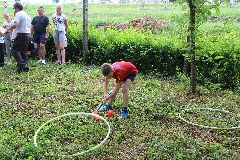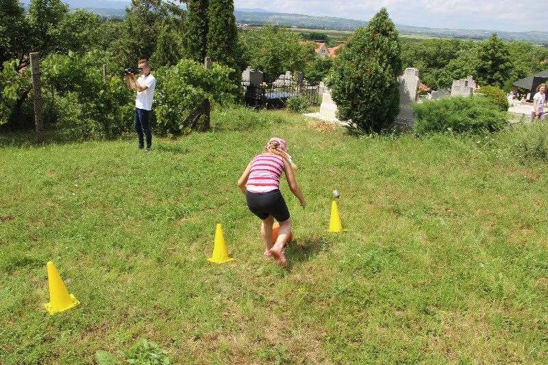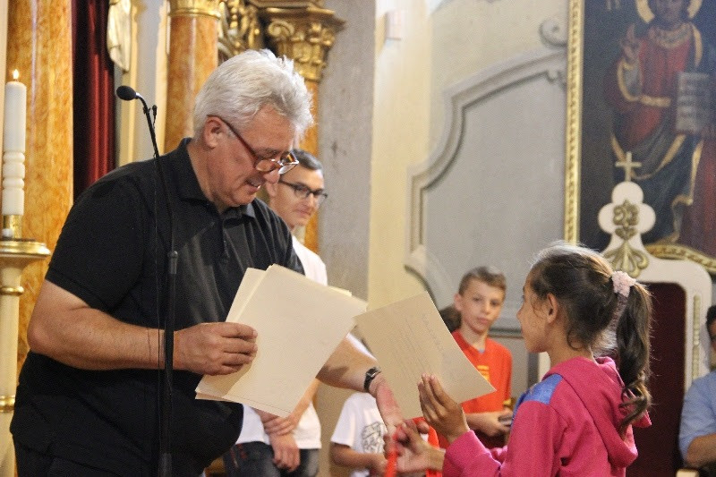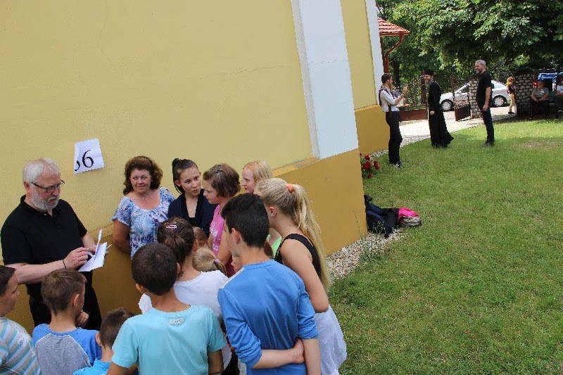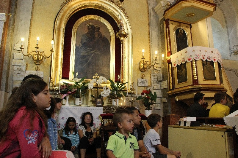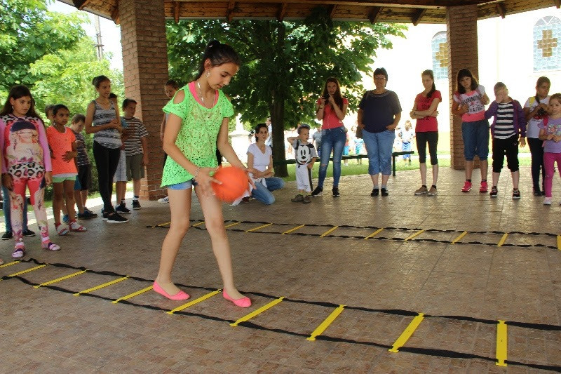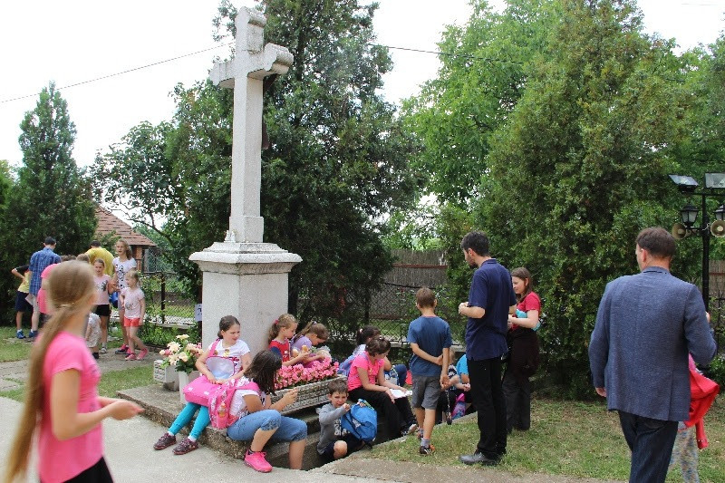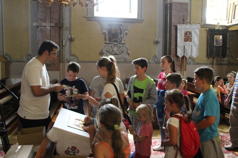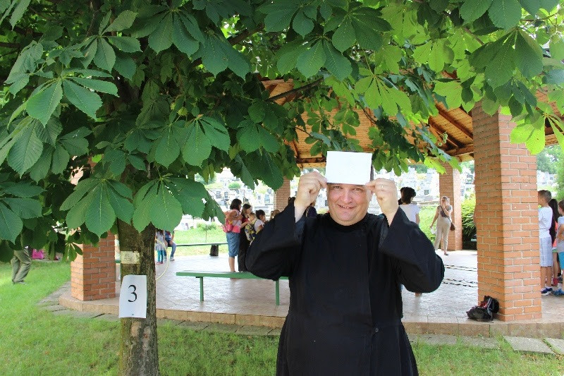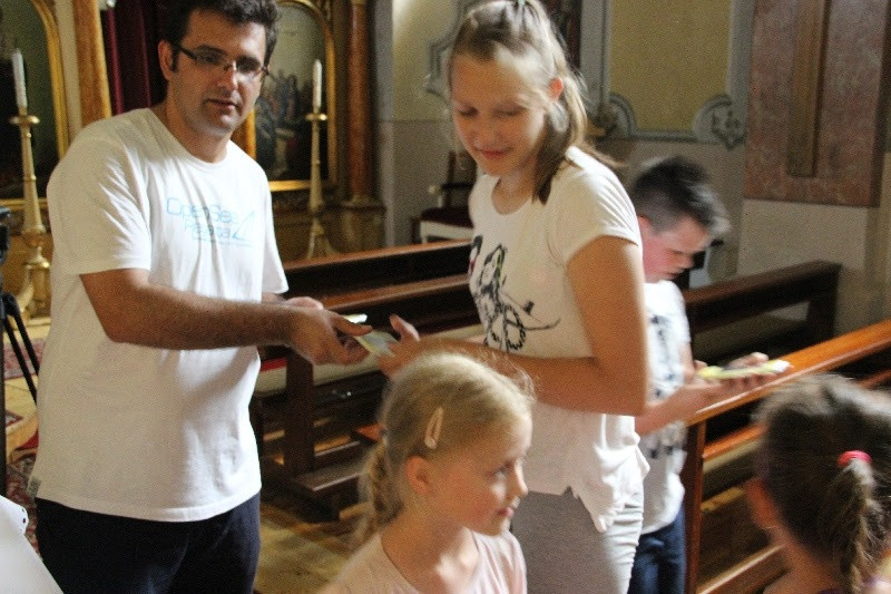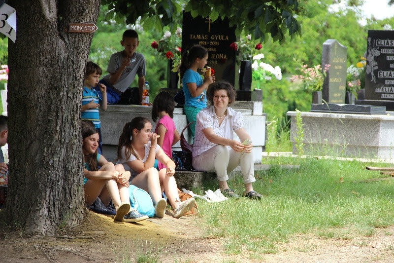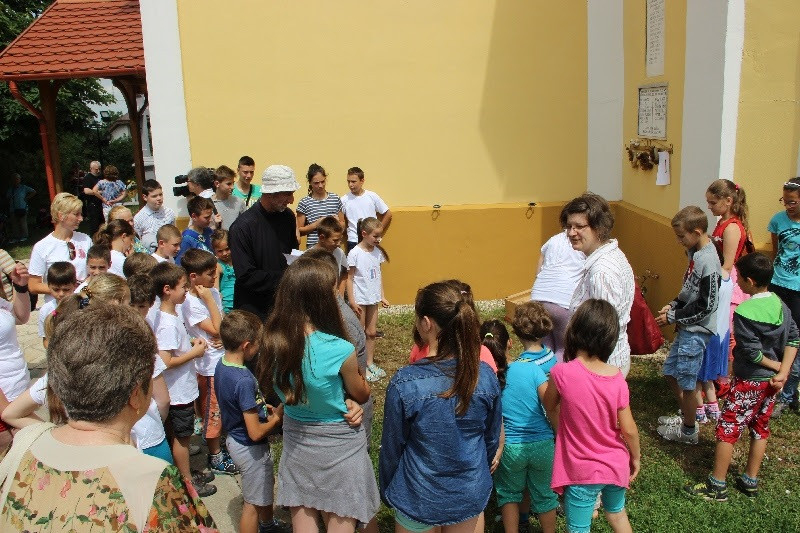 A liturgiát követően a templomban Kovács Lajos irotai parókus vezetésével gitárral kísért énekeket tanultak a gyerekek, eközben a felnőttek előkészültek egy képzeletbeli, 40 mezőből álló társasjátékra. Az adott mezőn minden csapat egy dobókocka segítségével dobott, és így tudott tovább lépni. Az egyes mezők feladatokat rejtettek magukban, amelyek megoldása esetén újabb dobás következett: bibliai kérdések, sportkérdések, ügyességi feladatok. A 40., s egyben utolsó állomás a kegytemplomban volt, ahol a kegykép előtt a csapatok az Üdvözlégy Mária kezdetű imával köszöntötték az Istenszülőt, illetve megkapták ajándékukat, az erre a napra külön készített „hittanos csokit”, amely csomagolásán egyik oldalt a sajópálfalai kegykép található, a másikon pedig a jó nyári szünet összetevői egy rövid imával.