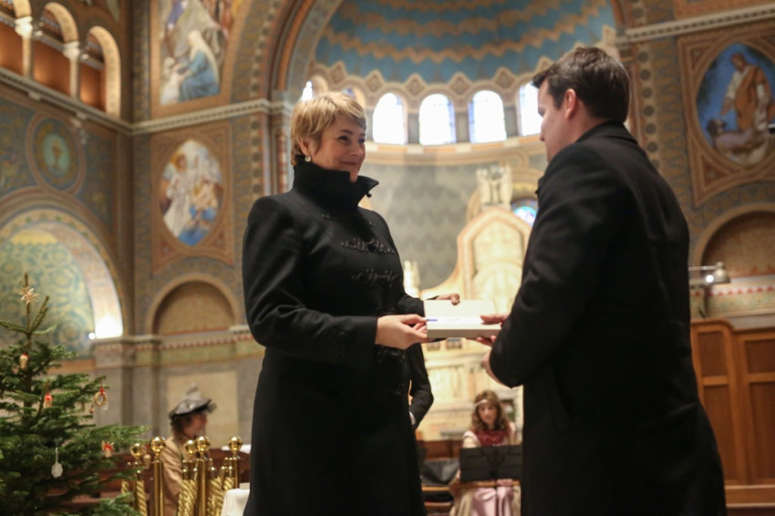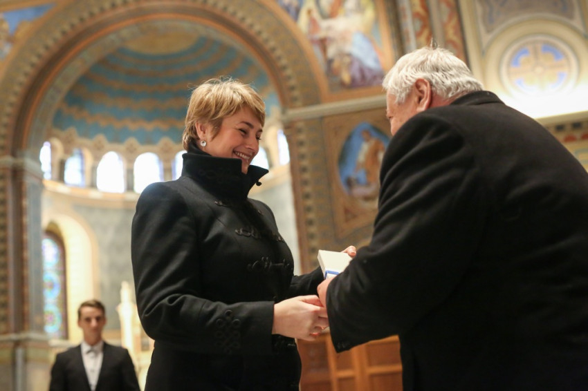 Csibi Krisztina a megnyitó alkalmából készült emlékplaketteket adott át, többek között Kiss-Rigó László püspöknek.