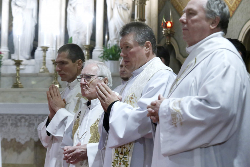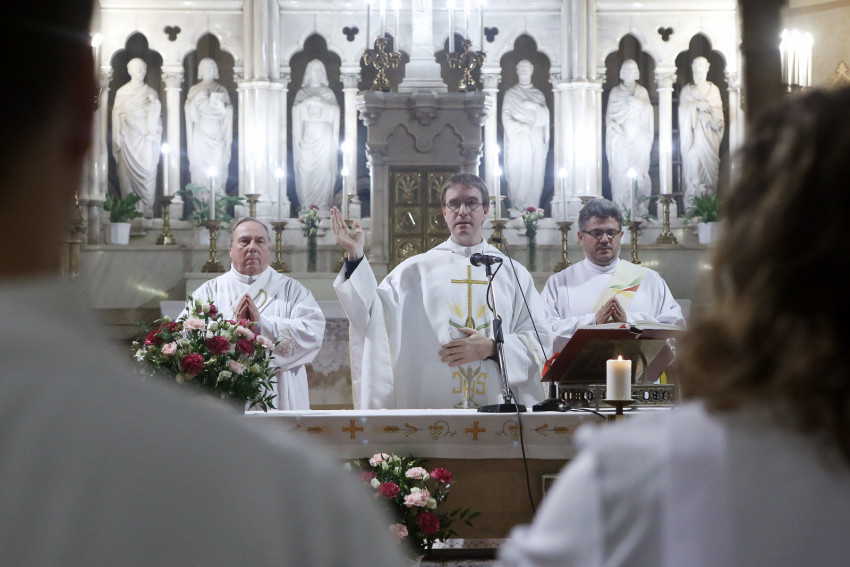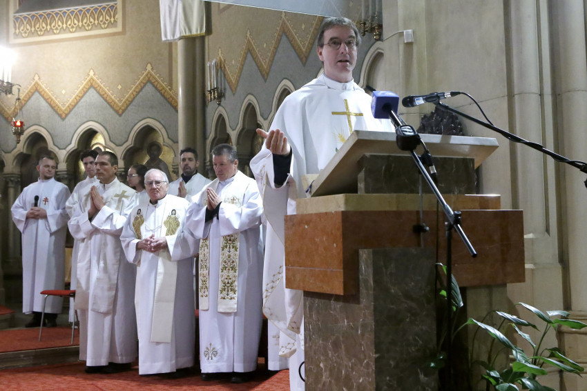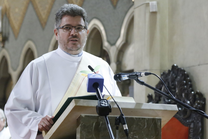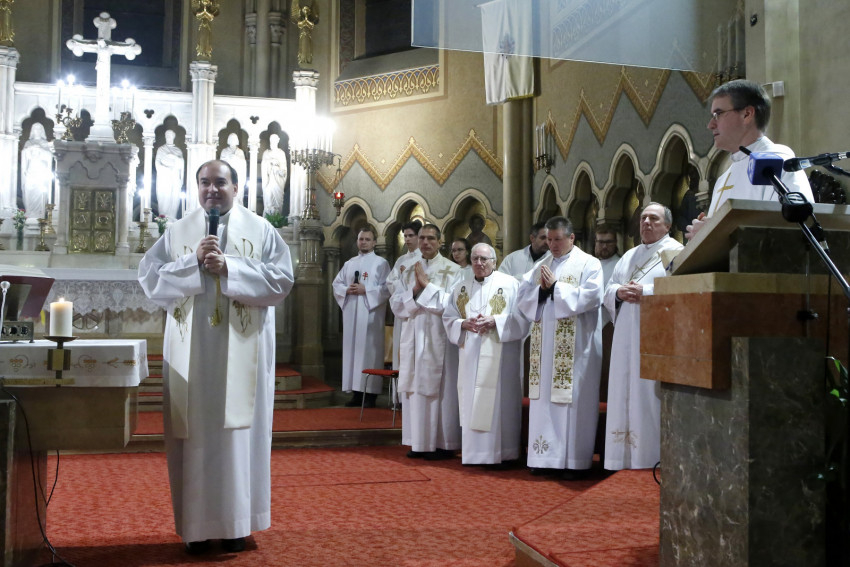 A megjelent lelkipásztorokat, a népes csapatot alkotó ministránsokat és a templomot teljesen megtöltő híveket Monostori László plébániai kormányzó köszöntötte, majd ismertette az est programját. Kiemelte, ez az este nemcsak az Angyalföldi Eucharisztikus Kongresszus, hanem a plébánia által meghirdetett, csütörtök esténként tartott Hit iskolája előadássorozat alkalma is, így a prédikáció és a szentmisét követő elmélkedés központi témája a Hitvallás lesz.