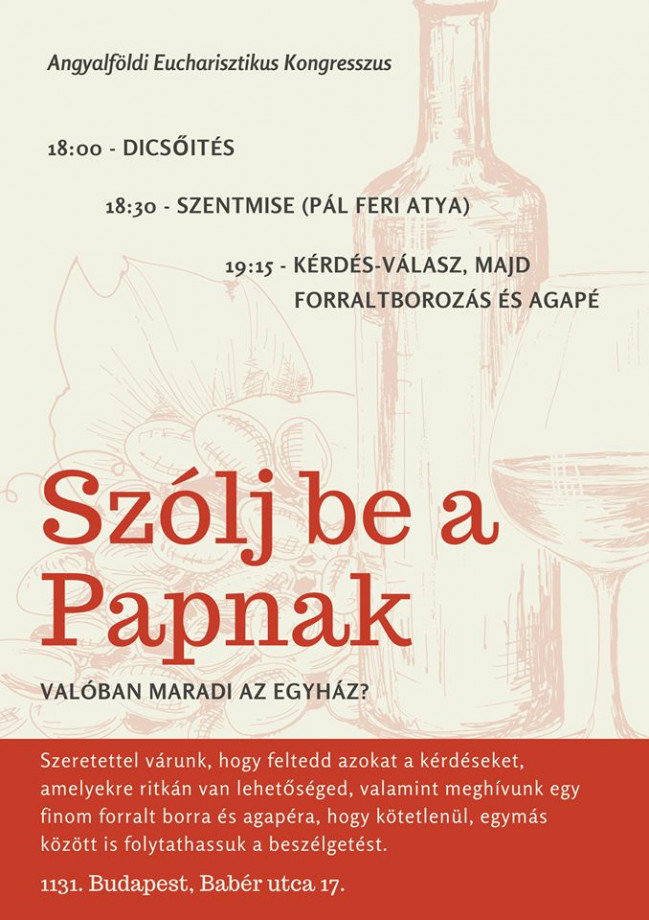 November 15-én, pénteken az Angyalföldi Szent Mihály-templomban 18 órától dicsőítő szentségimádás lesz (vezeti és gitározik: Hodász András), 18.30 szentmise – főcelebráns és szónok Pál Ferenc, 19.30 Szólj be a papnak! – Valóban maradi az Egyház? – akiket faggatni lehet: angyalföldi papok, utána pedig agapé és baráti beszélgetés a Vigyázó Miklós közösségi teremben.