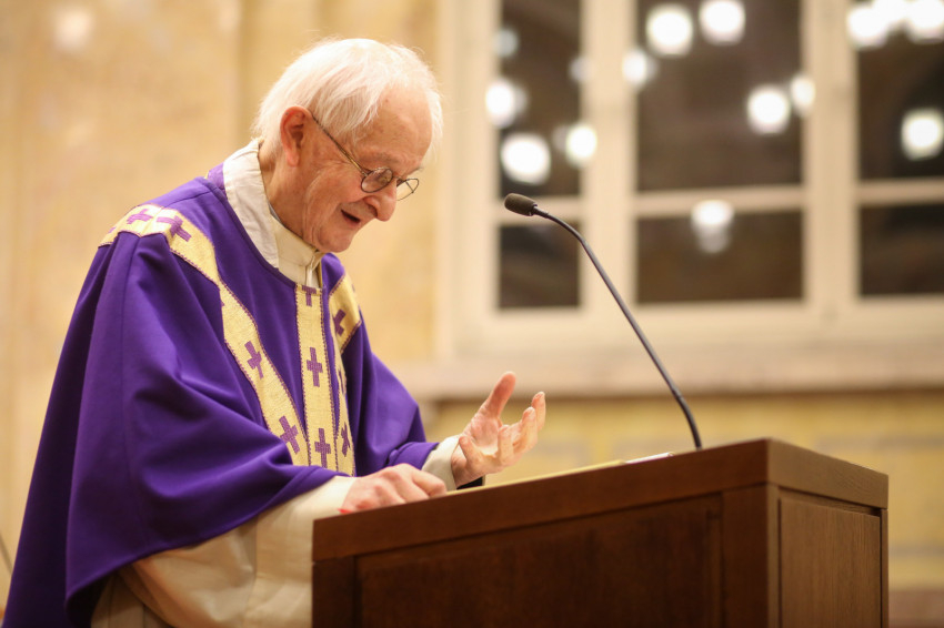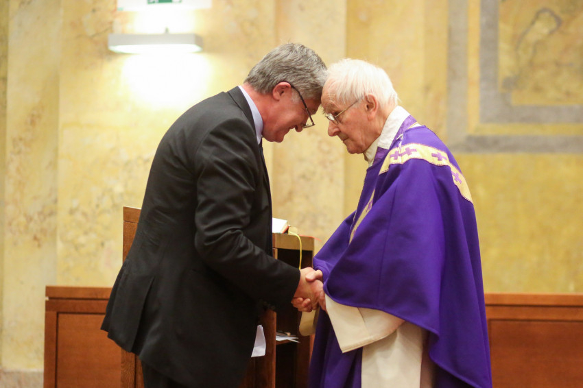 A szentmise homíliáját e szavakkal zárta: „Elmúltak fölöttem a tanítás és az alkotás évei. Visszahúzódtam Duna-parti rendházunkba, hogy nyugdíjasként azokkal az emberekkel találkozzam, akik életemben tanítványaim, barátaim, társaim voltak. Olyanokkal, akik előttem jártak, és lassan elköltöztek a másik világba, ahova bennünket is várnak. Így telt hát el fölszentelésem óta hatvan év, melyek áldásaiért most hálát adok az Úristennek. De kérem is, hogy azon, amit elkezdett velünk, illetve általunk, maradjon az ő áldása és vezesse tovább olyan utakra, melyeket már nem mi gondolunk ki, amikben mégis a jövőnek reménye sarjad. Így kérem az Úristent arra is, hogy az én életem hátralévő idejét tegye áldottá, készítsen föl arra, hogy elbúcsúzzam azoktól, akiket itt hagyok, tudjak igazi szívvel, fiatalsággal készülni a vele való találkozásra.”