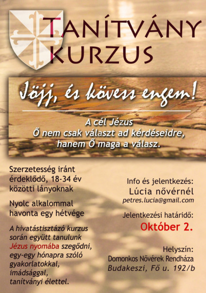 A szerzetesség iránt érdeklődő 18 és 34 év közötti lányok jelentkezését várják a nyolcalkalmas, havi egy hétvégét jelentő programra. „A hivatástisztázó kurzus során együtt tanulunk Jézus nyomába szegődni, egy-egy hónapra szóló gyakorlatokkal, imádsággal, tanítványi élettel” – olvasható a képzést meghirdető plakáton.