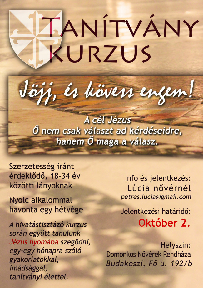További információ és jelentkezés: Petres Lúcia nővérnél (petres.lucia@gmail.com). A kurzust a domonkos nővérek rendházában tartják (Budakeszi, Fő utca 192/b).