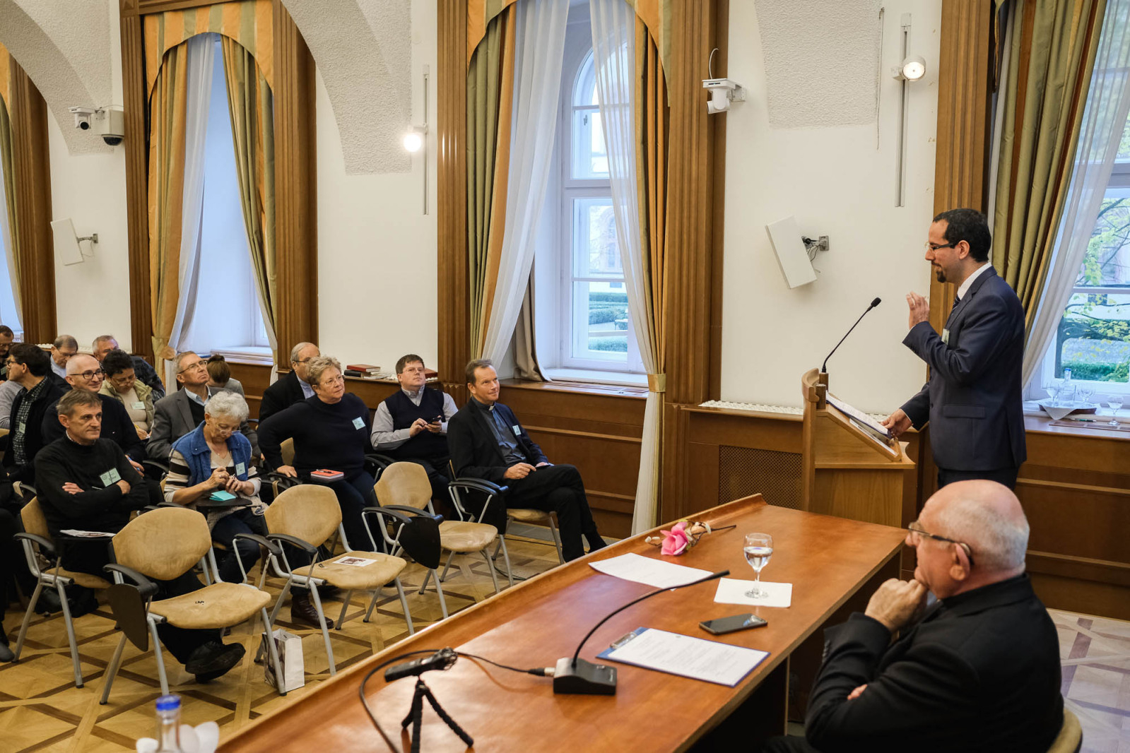 A püspök előadása kezdetén imában kérte a Szentlelket, hogy gazdagon áradjon ki, s „dicsőítse meg az Atyát köztünk és bennünk”. Továbbá hálát adott a világi és a paptestvérekért, akik nyitottak az együttműködésre az Egyházban.