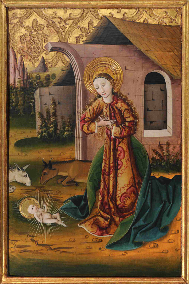 A Jézus születése tábla mindössze kétszereplős. Mária a szabadban térdelve imádkozik a megszületett, földön heverő gyermek Jézus előtt. Egy ökör és egy szamár gubbaszt a közelben, ugyancsak a térdelés mozdulatával. A helyszín azonosításához az egyszerű tetővel fedett, szebb napokat megélt, leomlott épület látványa nyújt segítséget. A háttérben zöldellő növények, kopár sziklák, az égbolt aranyszínben tündököl. Csak az evangéliumi szöveg ismeretében érthető a történet, de ahhoz képest azonnal feltűnik több zavarba ejtő részlet. Így biztosan nem eshetett meg Jézus világra jövetele, ha a vélhetően valóságos körülményekhez ragaszkodunk, legyenek azok mégoly mostohák is a betlehemi istállóban.