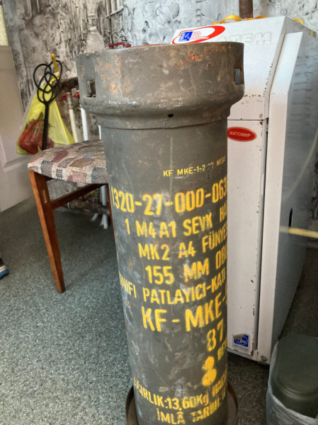 Egy löveghüvely, lőszer foglalata. Így is óriási, a benne lévő pusztító erő bizonnyal nagy károkat okozott.