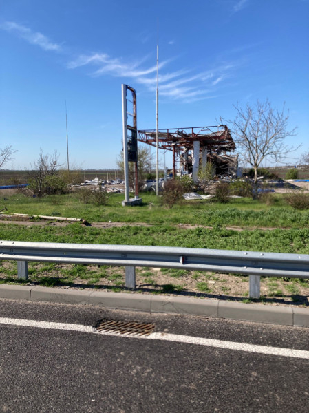 A város határában egy bunkerszerű megállítóponthoz értünk. Mind minket, mind az autót lefényképezték. Volt igazolásunk, hogy humanitárius segélyt viszünk Herszonba. Alá kellett írnunk egy nyilatkozatot, hogy a saját felelősségünkre lépünk be.