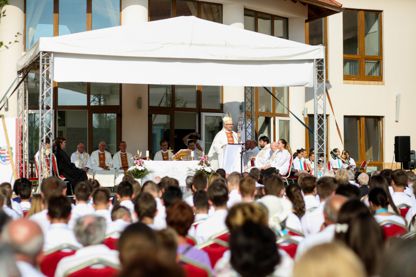 A megyéspüspök szentbeszéde végén azt kérte: „Hívjuk meg együtt Jézust ebbe az iskolába, de ne vendégnek, hanem lakónak!” Ha ő állandó tagja lesz a gimnázium közösségének, minden a legjobban fog menni, a tanulás, a tanítás is, és a szeretet egyre nagyobb lesz. „Ha egy tortát felszeletelünk, minél több részre osztjuk, annál kevesebb jut egy embernek. A jézusi szeretettel éppen fordítva van: minél inkább szétosztjuk, annál több jut mindenkinek. Ezt váltsuk életté itt, a Veresegyházi Katolikus Gimnázium új épületében!”
