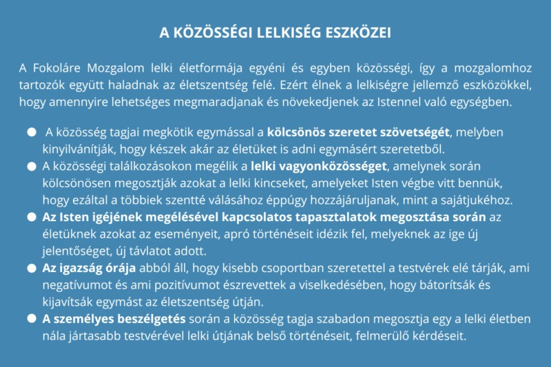 – Írtunk egy segédanyagot, amelyben olyan alapvető fogalmakat fejtünk ki, mint a személy szabadsága, a lelkiismeret szerepe a döntéshozatali folyamatban, vagy hogy hogyan lehet a megosztások során a titoktartást és a diszkréciót tiszteletben tartani, hogyan lehet jól alkalmazni azokat a gyakorlatokat (lásd a fenti képen), melyeken keresztül csoportjainkban megéljük a közösségi lelkiséget. (…)