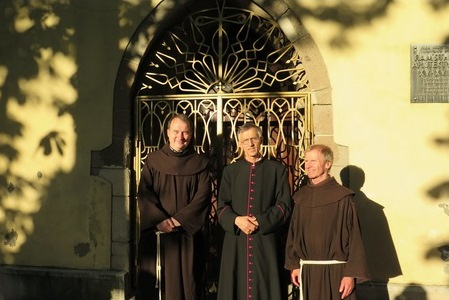 Majnek Antal munkácsi megyéspüspök (középen), Radics Dávid és Zatykó László a nagyszőlősi ferences templom kapujában