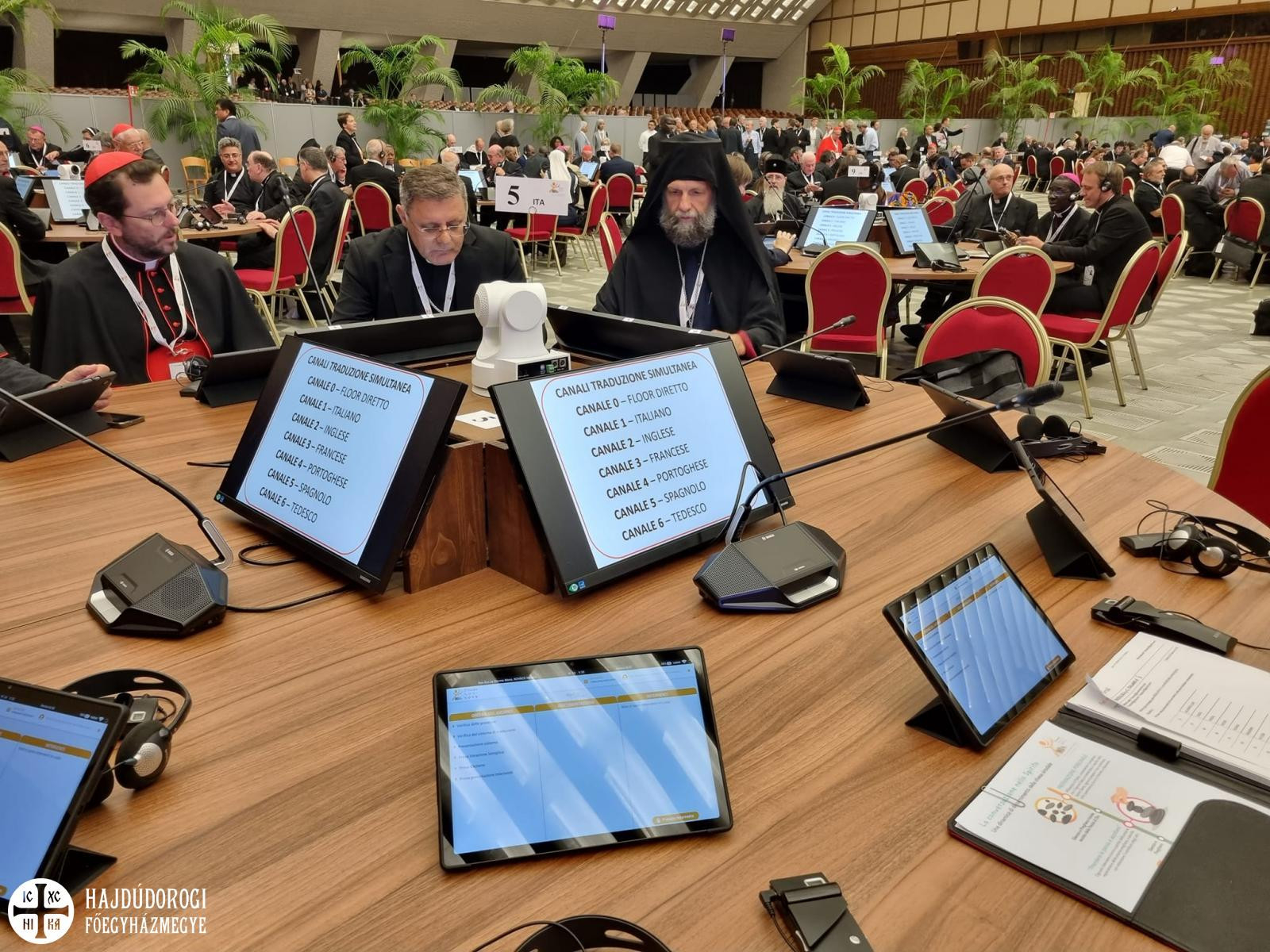 Az asztalokon négy-négy képernyő volt, azon keresztül mindenki láthatta az éppen beszélőt. Középen pedig volt egy kamera, s amikor valaki beszélt, automatikusan feléje fordult, és az ő képét adták az asztali képernyők. Ezeket az asztalokat, mint utóbb megtudtam, egy lengyel cég készítette, akik végül a teljes berendezést ajándékként ajánlották föl Ferenc pápának.