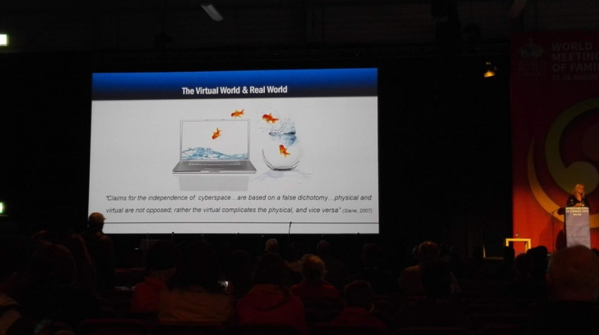 Az előadó egyik céljaként azt jelölte meg: szeretné elérni, hogy másként gondolkodjunk az internetről, az online világról: hajtsunk végre paradigmaváltást. Most a valódi világban vagyunk – mondta a hallgatóságnak –, ha pedig fölmegyünk az internetre, a kibertérbe kerülünk. Gyakran csak öt percre megyünk fel, „csak megnézem a leveleimet” – mondjuk családtagjainknak, és hipp-hopp eltelt 40-50 perc… Mert az időérzékelést torzítja az online világ. Ha belegondolunk a szavakba: „fórum”, „világ” – ezek környezetekre, helyekre utalnak; valaki szerint az internet hadműveleti terület, háborús zóna. Hasznos, ha a társadalom erre odafigyel, és helyként kezeli az online világot – és akkor rögtön látjuk azt is, hogy védelemre, szabályozásra is szükség van.