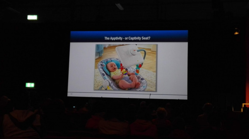 Az előadó negatív példaként megemlítette a Fisher-Price cég babaülőkéjét, melyet Apptivity Seat néven forgalmaznak, bár Mary Aiken szerint a Captivity Seat (Fogság ülőke) megfelelőbb terminus lenne. A baba elé – aki még csak napi öt órát tölt ébren – egy iPad van rögzítve, amin Disney-videókat és más számítógéppel generált grafikákat néz. Nem kell nagy zseninek lenni ahhoz, hogy belássuk: ez biztos, hogy semmi jóra nem vezet. Lehet, hogy rendkívüli számítógépes képességei lesznek ezeknek a gyerekeknek, de nem tudnak majd elkapni egy labdát, vagy átmenni egy úton.