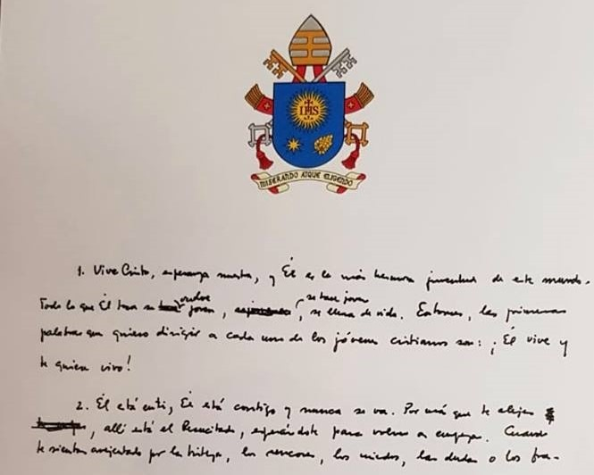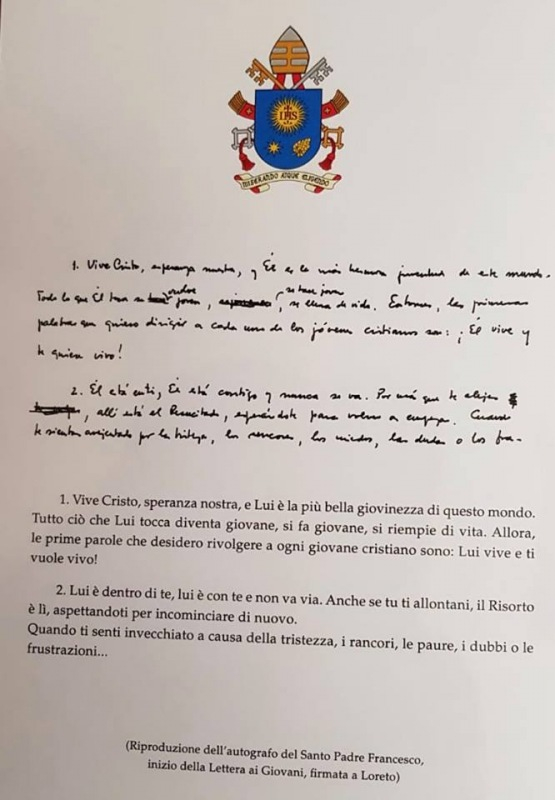 Így kezdődik a Ferenc pápa saját kézírásával írt rövid levél, amelyet maga a Szentatya fogalmazott a fiataloknak, és melyet hétfőn, Loretóban fog aláírni a délelőtti mise után.