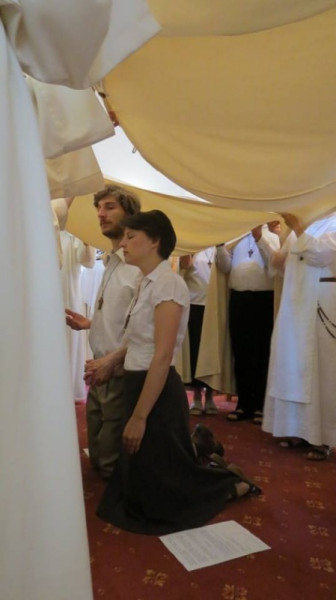 Az újonnan elkötelezett házaspárokért mondott ima közben egy köpenyt tartottak a párok felett, amely a Szentlélek szimbólumaként a prófétaság és a közösség karizmájában való részesedés jele is egyben.