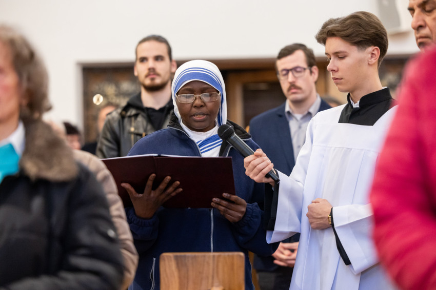 A keresztutat követő szentmise különleges erővel közvetítette a Plébániai Unió egységét. A főcelebráns püspököt és a három koncelebráló papot ministránsok hosszú sora kísérte.