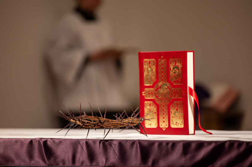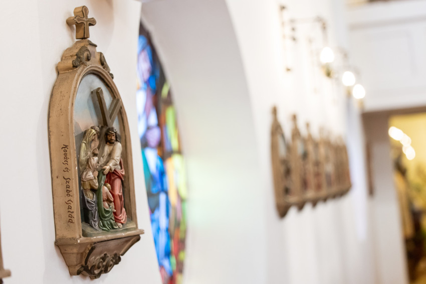Az oltárasztalon töviskorona és Szentírás, az oltár mellett kereszt és szögek – egyszerű, mégis megrendítő jelképei a nagyböjti készületnek.