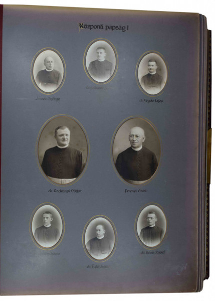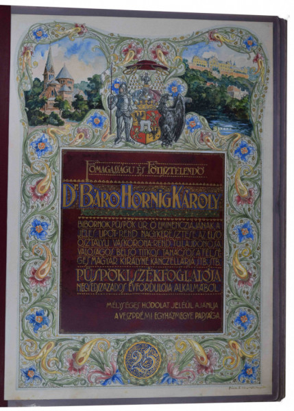 Hornig Károlyt püspökké szentelésének huszonötödik évfordulóján többnapos ünnepségsorozattal köszöntötték. A papság ajándékainak átadására 1913. szeptember 8-án rendezett díszebéd előtt került sor. A jubileumi album Veszprémben készült, Pósa Endre könyvkötő műhelyében. A kötet aranymetszéssel díszített, gömbölyített lapokból áll. A címoldalon olvasható ajánlás után az Oh nap, egy negyedszázad foglalatja kezdetű himnusszal köszöntik a főpásztort. A kötet oldalait ovális, aranyozott szélű paszpartukba illesztett fényképek alkotják. A fotográfiák a Veszprémi Egyházmegye áldozópapságát örökítik meg: lefényképezték a püspöki aula papságát, az esperesi kerületekben szolgáló plébánosokat és káplánokat, az egyházmegye nyugalmazott lelkipásztorait, illetve a külföldön tevékenykedő papokat is. A sötétvörös, egészbőr borítású albumot fém veretek ékesítik. Az előzékek selyemborításúak, áthajló sárgaréz zárókapocs fogja össze a könyvtáblákat.