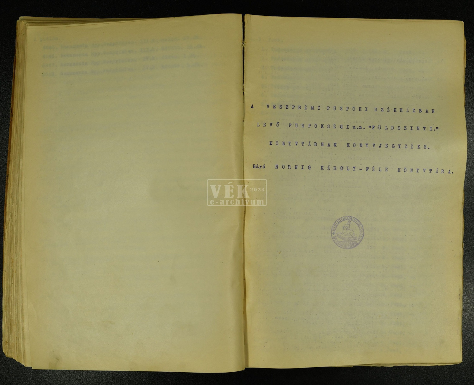 A Veszprémi Érseki Könyvtár 31 824-es raktári jelzet alatt őrzi Hornig Károly püspök magánkönyvtárának a főpásztor halála után készített gépiratos leltárkönyvét. A könyvek összeírására a püspöki javadalom átadás-átvételi eljárása során, 1917 és 1922 között kerülhetett sor. A leltárkönyvborítóján elhelyezett címkén ceruzás bejegyzés olvasható: „Hornig 1917.” A címoldalon a könyvkötő bejegyzése található: „Püspőksék (sic!) puha táblával vászon hát.” A könyvek a jegyzék szerint a veszprémi püspöki palota földszinti és emeleti termeiben voltak elhelyezve.
