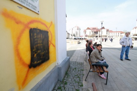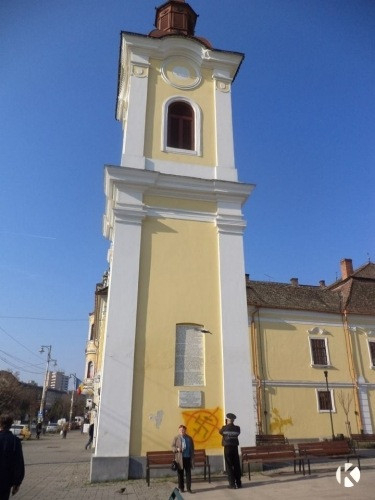 Az éj leple alatt a tettesek a Noua Dreaptă szélsőséges szervezet kelta keresztes jelképébe egy horogkeresztet festettek a Színház téri torony oldalára. Néhány perc múlva ugyanők firkálták össze obszcén feliratokkal a Vatra Românească nevű szervezet főtéri székházának ablakait.