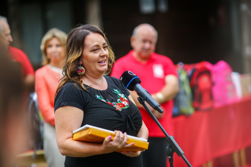 Anita asszony és Gábor atya átadta egyesével a név szerint előkészített iskolatáskákat; Grexa Liliána kiosztotta a mesekönyveket, majd közös kép készült a csapatról.