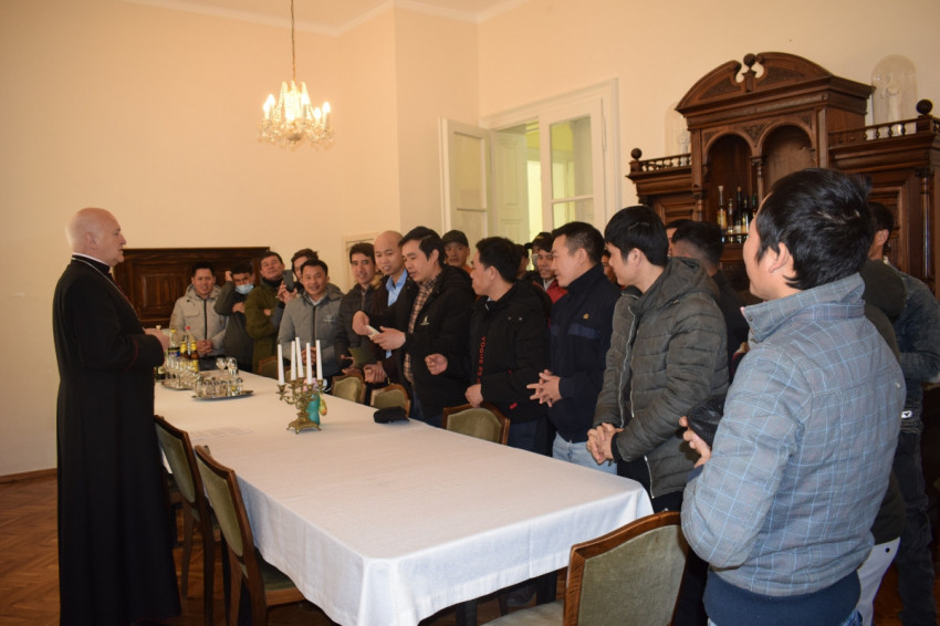 A húsvétvasárnapi szentmise után a vietnámi vendégmunkások köszöntötték Német Lászlót.