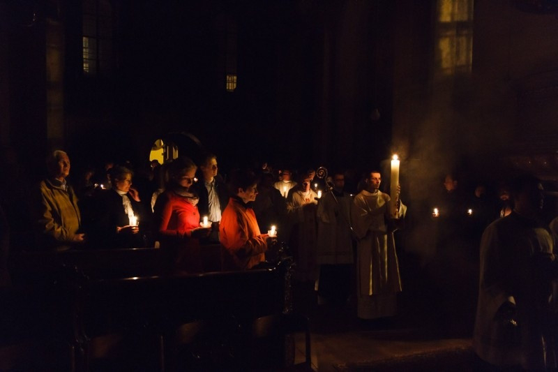 A veszprémi Szent Mihály Főblébánián a bazilika bejárati előterében tűzszenteléssel vette kezdetét a fény liturgiája, majd fellobbant a húsvéti gyertya.