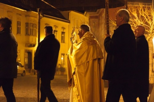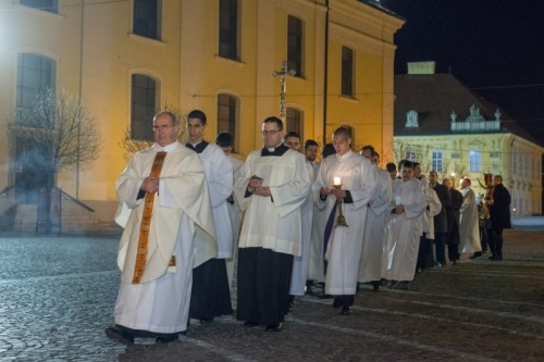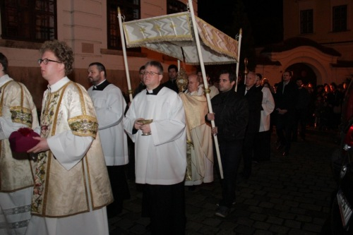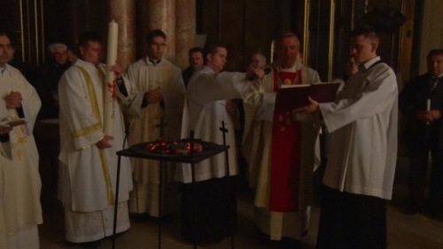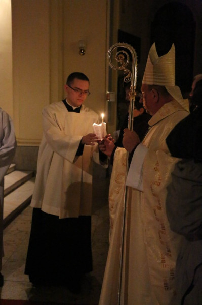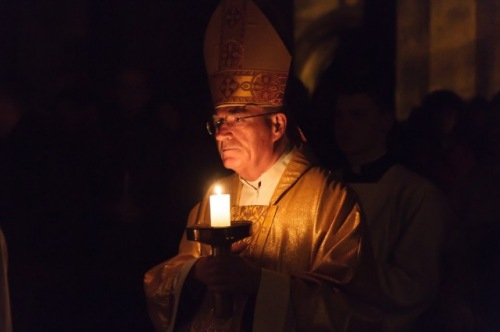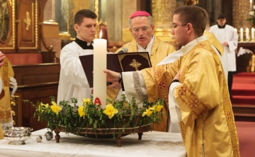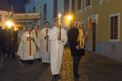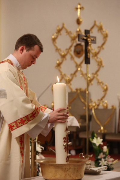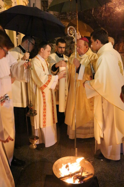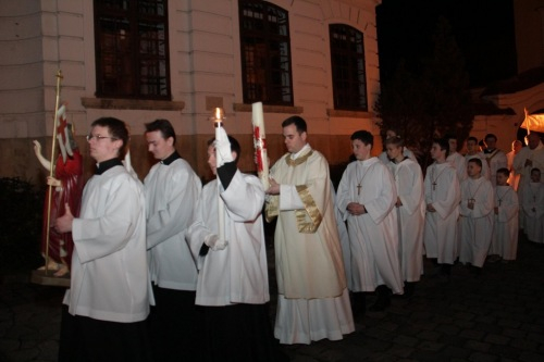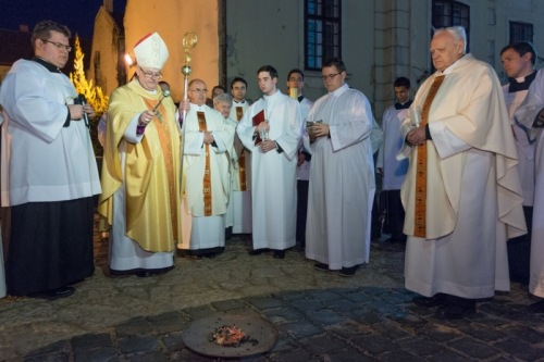 Hitünk legnagyobb eseményének, Jézus Krisztus feltámadásának ünneplését már húsvét szent éjszakáján, az éj beállta után kezdi az egyház. A Szent Ágoston által minden vigíliák anyjának nevezett szertartás kezdete idén – a székesegyház előtti tér felújítási munkái miatt – a templomon belül zajlott: Veres András megyéspüspök megáldotta a tüzet és a húsvéti gyertyát, majd körmenetben vitték a lángot a templomba.