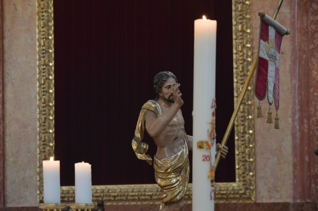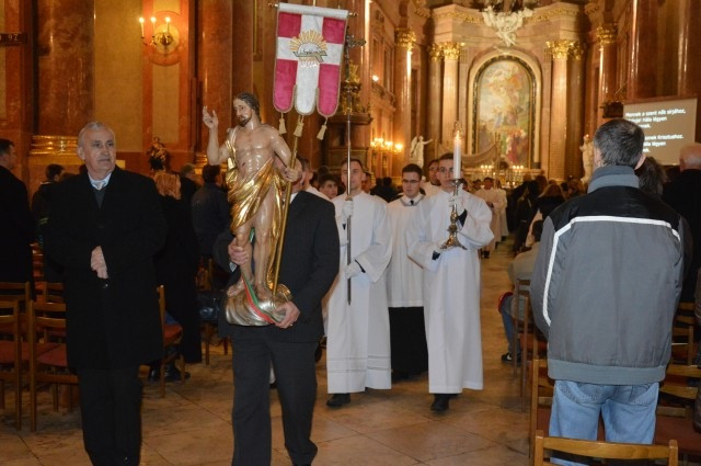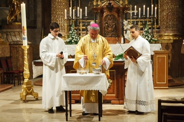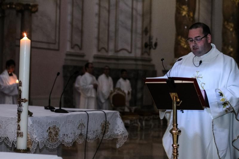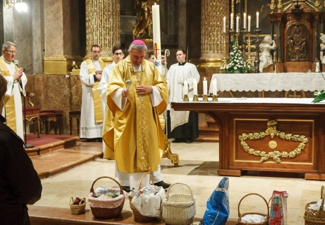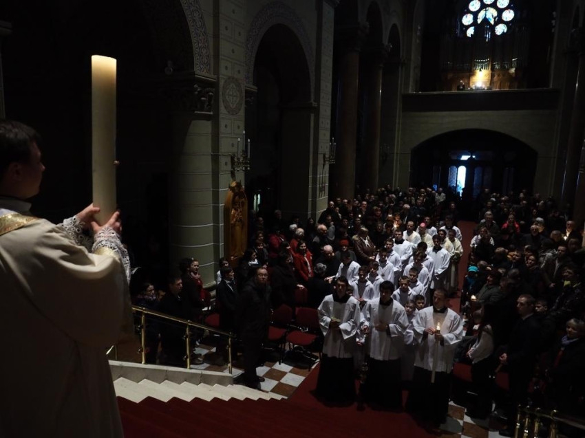 Az égő húsvéti gyertya magát Jézust szimbolizálja. Krisztus volt az, aki azt mondta a legnagyobb erény a szeretet. A szeretet az, amely elvezet bennünket az örök üdvösségre. Krisztusnak ez a szeretete kiáradt minden emberre. Kérjük a halálból feltámadt Jézust, tanítson meg minket az igaz szeretetre – buzdított a főpásztor, majd vizet szentelt és két fiatal felnőttet megkeresztelt. A szentmise végén a feltámadási körmenet után – melyet a szakadó eső miatt a bazilikában tartottak – az ételek megáldásával zárult a szertartás.