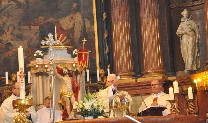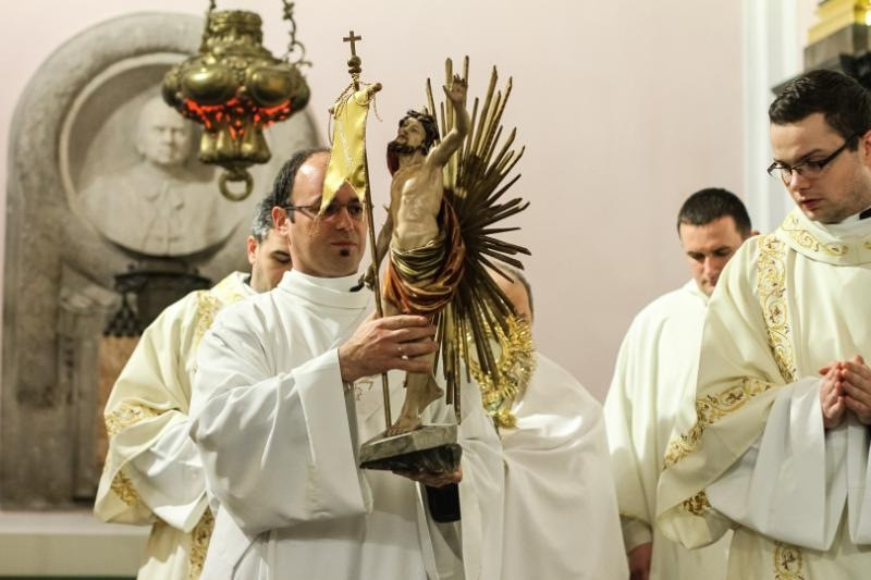 Az alleluja visszaadása, s az evangélium felolvasása után a főpásztor a húsvéti öröménekről, és keresztségünkről elmélkedett szentbeszédében. A keresztvíz megáldása után a híveket meghintette a keresztségünkre emlékeztető vízzel, majd az ünnepi szentmisében hálát adott a keresztség kegyelméért. A rossz idő miatt a körmenet csak a templomon belül haladt körbe, de így is sikerült tanúságot tenni a feltámadt Úr nagy szeretetéről.