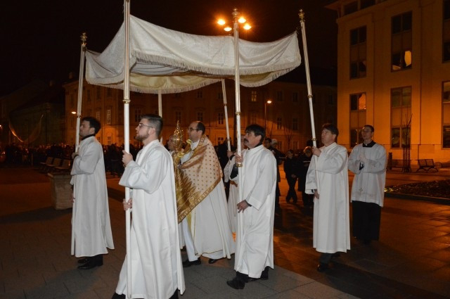 Az eső miatt a körmenet elmaradt. A szentségimádás után, a hívek elbocsátása előtt Spányi Antal jókívánságát fejezte ki. Elmondta, hogy végigéltük a nagyhét eseményeit, a bevonulás örömét, majd a szomorúságot. Jézus magára vette bűneinket, meghalt értünk, hogy örök életünk lehessen. Meghalt, eltemették, de feltámadt. Ma este az Egyház gyermekei szerte a világon ünneplik Krisztus feltámadását, az Élet győzelmét a halál felett. Ez az új Élet a mienk. Engedjük a hit örömét szívünkbe, hogy az rajtunk keresztül a világba áradhasson. Legyünk részesei a világ jobbá tételének a szentek és magyar szentjeink nyomában. Napjaink teljenek örömben, békében és a megújuló életben.