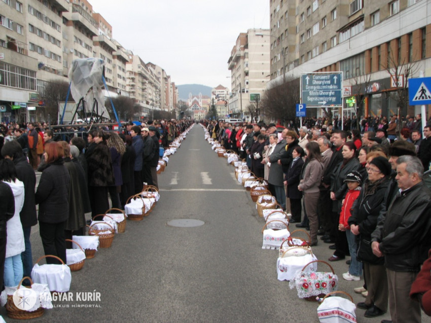 A húsvéti ételszentelés Csíkszeredában megőrizte évszázados, eleven ünnepélyességét, reggel 8 órakor rendezett sorokban várták a hívek, hogy püspöki áldásban részesüljenek a kosarakban helyezett eledelek.